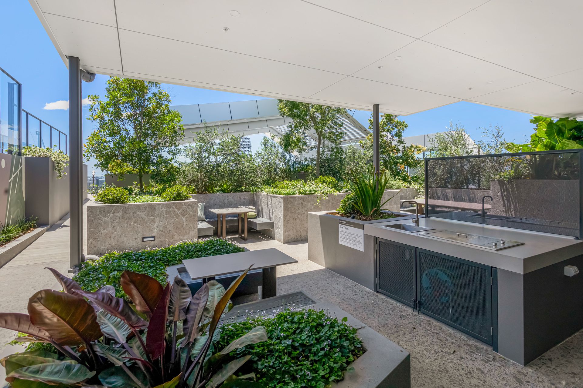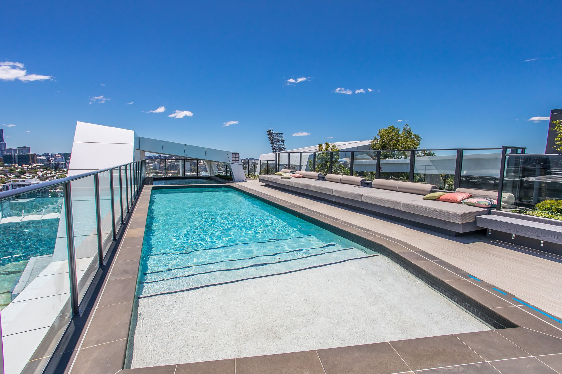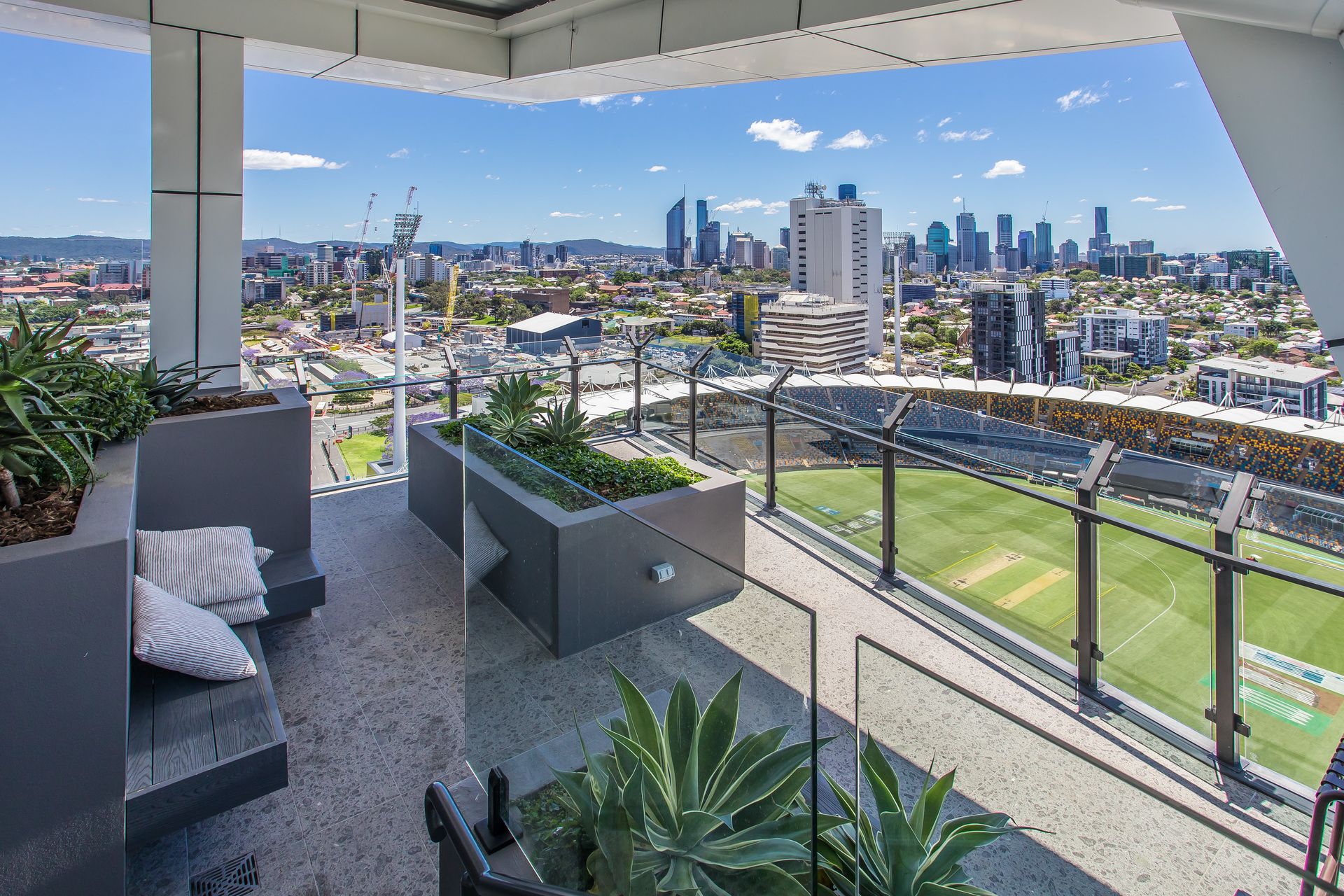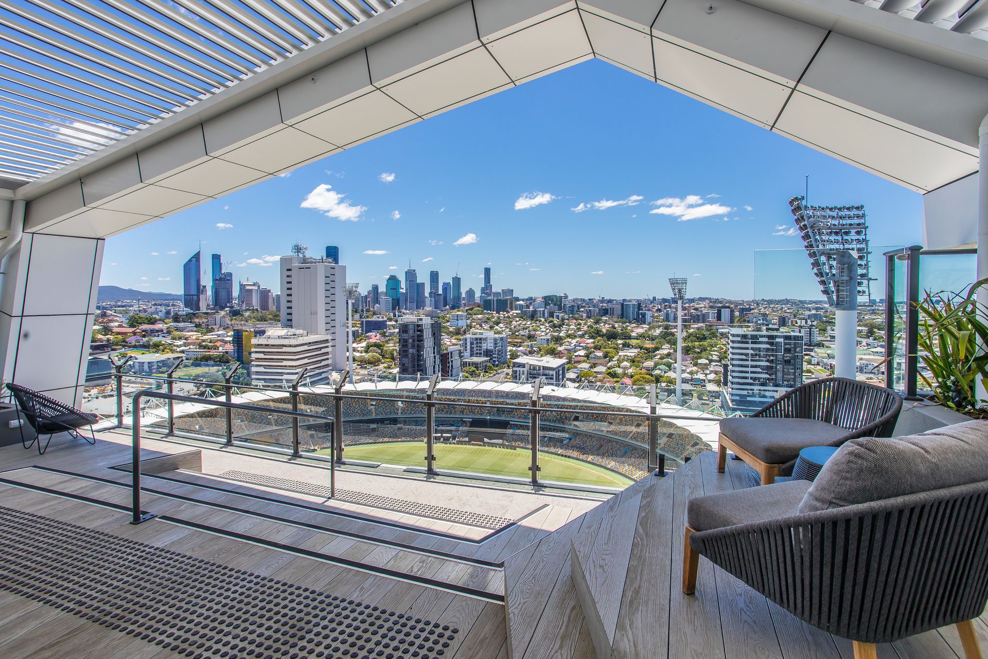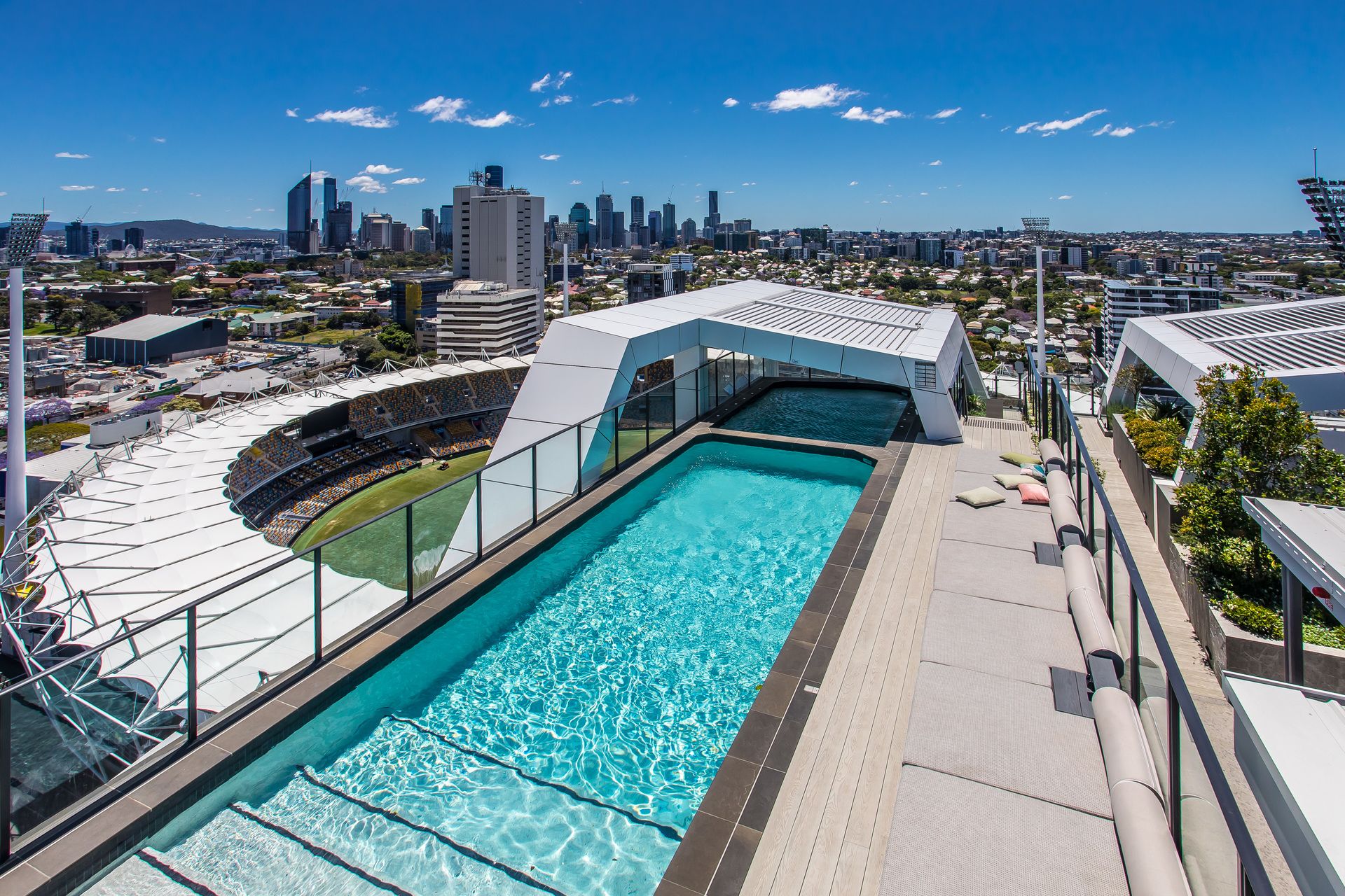 Rooftop ‘skystand’ with direct City views and recreation areas. Featuring a bird’s eye view of The Gabba, you will enjoy front-row sets to sports games, concerts. Perfect for entertaining, this alfresco retreat comes complete with a swimming pool, terrace, spa, dining and lounge spaces plus a gym.